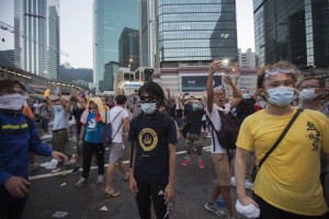 HKG07. Hong Kong (China), 28/09/2014.- Pro-democracy protesters are seen during the first day of the mass civil disobedience campaign Occupy Central, Hong Kong, China, 28 September 2014. Thousands of pro-democracy demonstrators surrounded central government offices and blocked major streets in Hong Kong on Sunday to protest China's decision to restrict open elections in the territory. The protests followed a decision last month by China's top legislative body to restrict the nominations for chief executive in 2017. The candidate who wins the popular vote would have to be formally appointed by the central government before taking office. (Elecciones, Protestas) EFE/EPA/ALEX HOFFORD