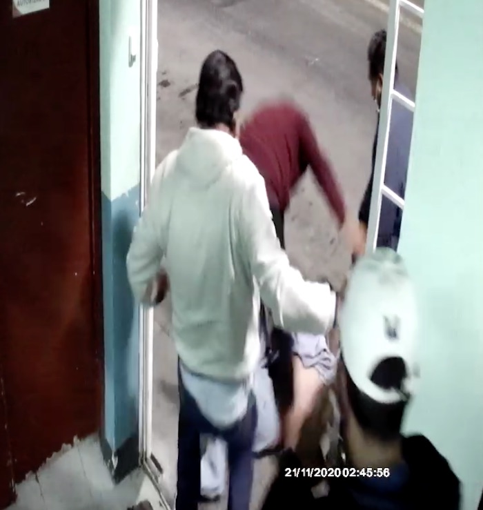 El señor subió al quirófano con otro familiar. Lo tomaron de brazos y piernas, y lo bajaron cargando por las escaleras. Otros hombres y una mujer también se aproximaron y lo sacaron de la clínica. El doctor, aún con su pijama de quirófano, fue golpeado e insultado, se ve en un video de la clínica.