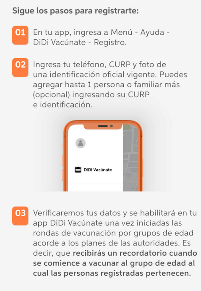 DiDi México explicó que las y los usuarios deberán registrarse en la aplicación, en la sección “DiDi Vacúnate”, donde tendrán que ingresar su teléfono, CURP y la foto de una identificación oficial vigente.