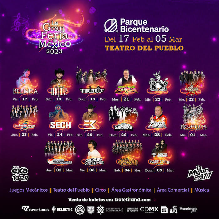 Belinda, Gerardo Ortiz, Moderatto, Sonido Fascinación, Los Kumbia Kings, El Gran Silencio, La Arrolladora, Sech, Edén Muñoz, La Vecindad Santanera, entre otros, se presentarán en el Teatro del Pueblo en el marco de La Gran Feria de México.