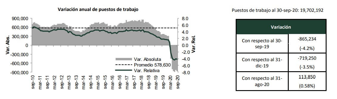 La pandemia de la COVID-19 cobró 1.1 millón de puestos de trabajo formales, ante esto, la cifra de más de 113 mil empleos representó un aumento mensual de 0.6 por ciento, respecto de los 92 mil 390 empleos formales creados en agosto. En julio desaparecieron 3 mil 907 puestos, 83 mil 311 en junio, 344 mil 526 en mayo, 555 mil 247 en abril y 198 mil 033 entre el 13 y el 31 de marzo, al inicio de la contingencia sanitaria que significó el inicio del confinamiento en México.
