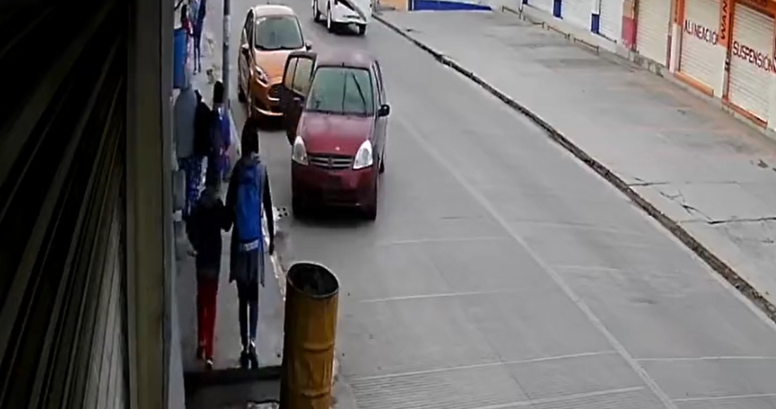 En un video que circula en redes sociales se observa el momento en el que avanzan niños y sus madres rumbo a la escuela cuando ambos hombres descienden del automóvil con armas y comienzan a amenazar a una mujer hasta que logran quitarle al niño.
