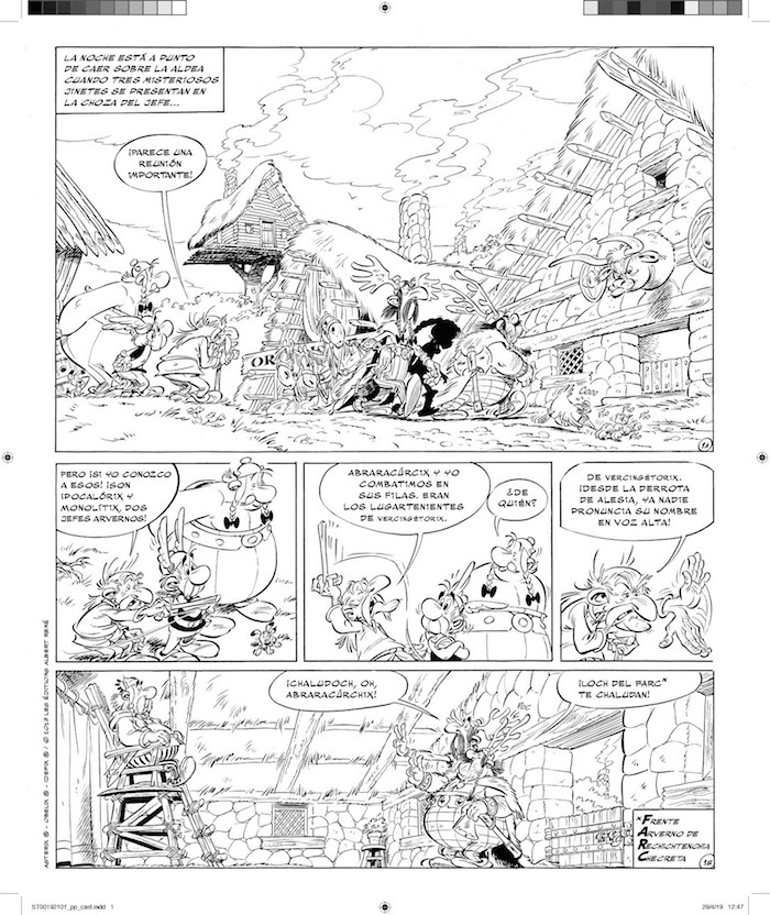 En la página, facilitada en exclusiva a Efe por la editorial Salvat, se ve cómo estos dos jefes arvernos llegan a la aldea ante el asombro de Astérix, Obélix y Panoramix. Y es precisamente el druida el que reconoce a estos dos visitantes, lugartenientes de Vercingétorix.
