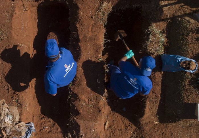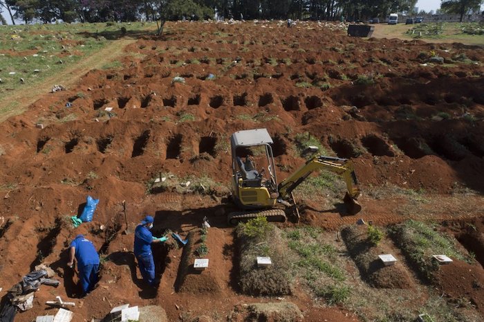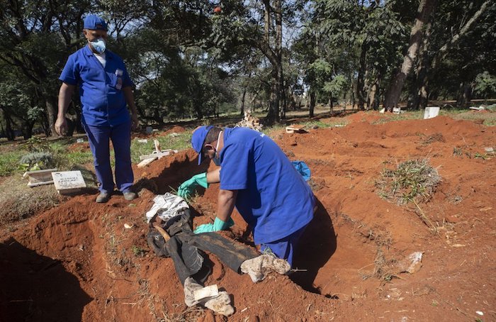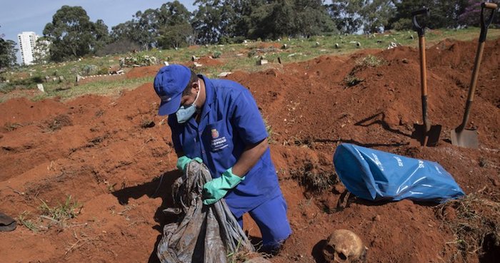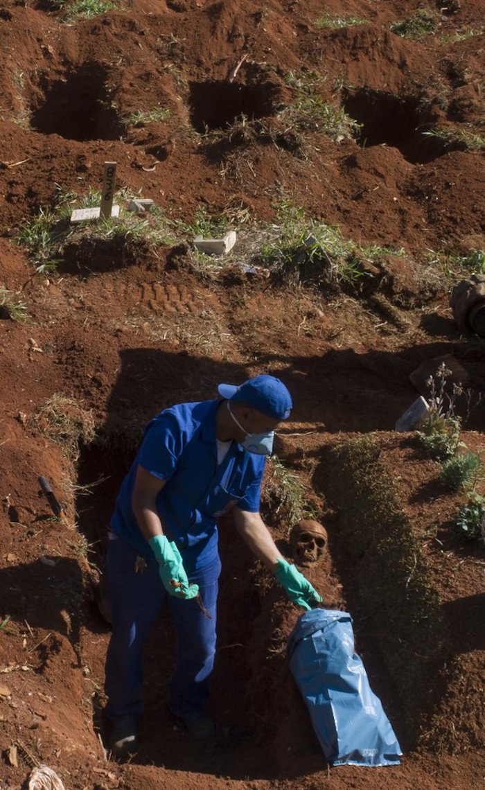 En el mayor cementerio de Sao Paulo, Vila Formosa, Adenilson Costa es uno de los trabajadores que, enfundados en un traje de protección azul, abrían viejas tumbas el viernes. Según contó, su trabajado se ha complicado durante la pandemia y, mientras sacaba huesos de los ataúdes desenterrados, dijo que teme que lo peor esté por llegar.