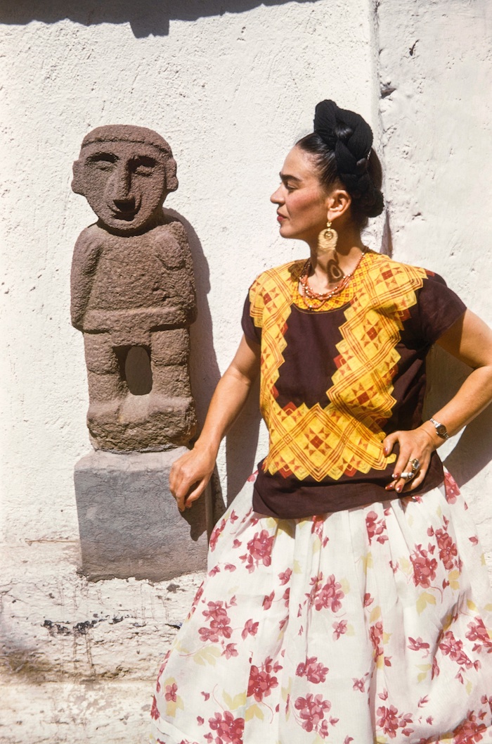 Frida Kahlo junto a una escultura prehispánica en el jardín de la Casa Azul, 1951. Foto: Taschen / EFE