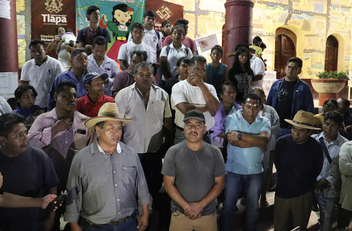 Integrantes del Frente Popular de la Montaña en su conferencia frente al Palacio Municipal de Tlapa para demandar que las autoridades de los tres niveles de gobierno entreguen con vida a Arnulfo Cerón Soriano . Foto: Antonia Ramírez, El Sur.