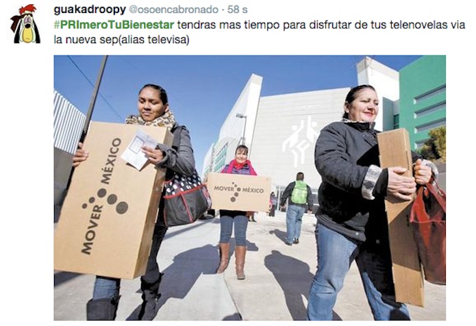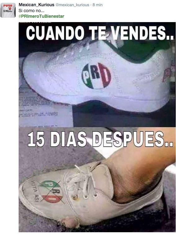 algún compa ‏@lovetroniks "#PRImeroTuBienestar pues ni con despensas, tarjetas o dinero en efectivo. mmta con peñabots y hashtags menos. Hasta sale contraproducente!!"