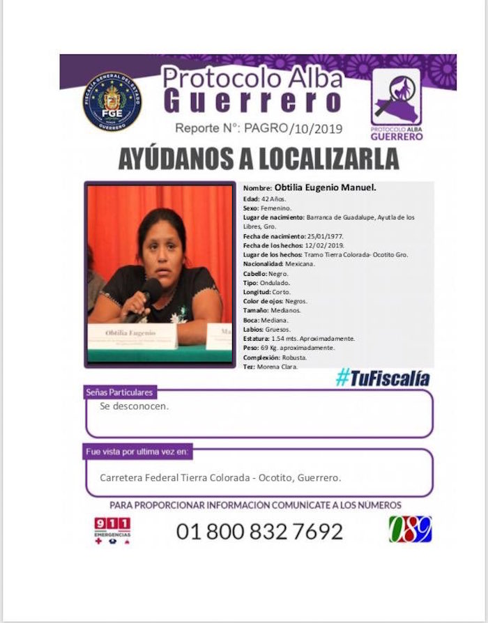 Chilpancingo, Guerrero, 14 de febrero, (ElSur/SinEmbargo).- El secretario de la Organización de Pueblos Indígenas Me phaa (OPIM), Cuauhtémoc Ramírez, confirmó la desaparición de su esposa, la presidenta de esa organización, Obtilia Eugenio Manuel. Declaró que la mañana del martes, ella venía huyendo de Ayutla rumbo a Chilpancingo porque, desde el sábado, las amenazas de muerte arreciaron en su contra. La líder iba a acompañada de Cornelio Castro, también integrante de la organización y quien también está desaparecido.