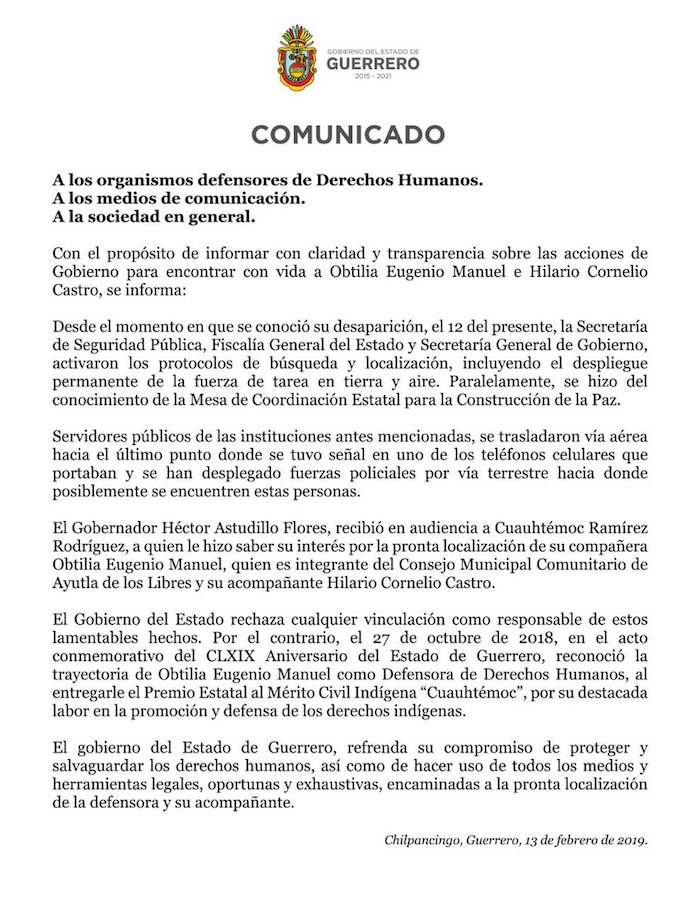 “El gobierno del estado rechaza cualquier vinculación como responsable de estos lamentables hechos, por el contrario el 27 de octubre del 2018 en el acto conmemorativo del Aniversario del Estado de Guerrero, reconoció la trayectoria de Obtilia Eugenio Manuel como Defensora de Derechos Humanos”, se lee en un comunicado.