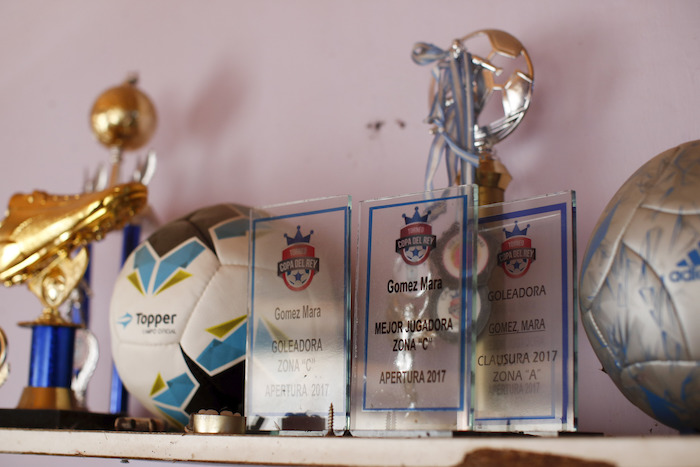 De altura imponente y figura atlética, Mara Gómez, de 22 años, los observa y esboza una sonrisa. “Cuando empecé era muy mala, pateaba al arco y la pelota iba para cualquier lado”, cuenta.