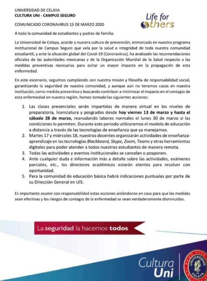 En el comunicado colocado en su portal de red social, la Universidad de Celaya recomendó asumir con responsabilidad las acciones preventivas y aislarse en sus hogares hasta descartar posible contagio.