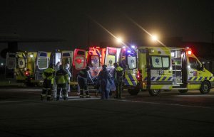 Trabajadores médicos trasladan a un paciente de COVID-19 para ser llevado en avión a la ciudad de Concepción, para liberar espacio en las unidades de cuidados intensivos. Foto: Esteban Félix, AP.