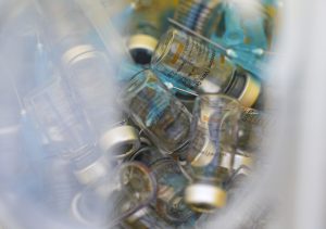 Frascos vacíos de la vacuna Sinovac para COVID-19 llenan un contenedor en el Complejo Deportivo La Pintana, ahora un sitio de vacunación. Foto: Esteban Félix, AP.