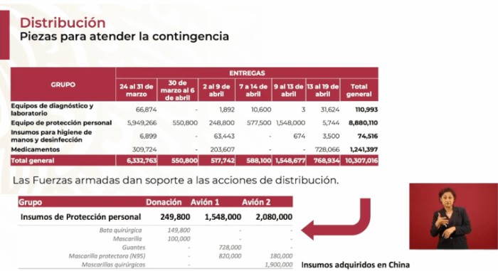 Agregó que entre equipos de diagnóstico, equipo de protección del personal, material sanitizante y medicamentos, se tiene previsto entregar un total de 10 millones 307 mil 016 de insumos. Lo anterior en un periodo comprendido desde el 24 de marzo y hasta el 19 de abril.