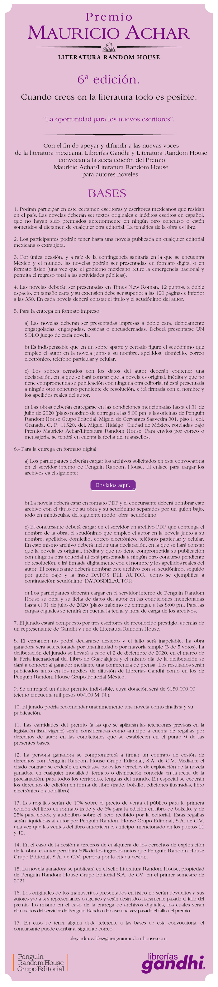 "Instamos a los interesados a revisar a detalle la convocatoria del Premio Mauricio Achar 2020, la cual podrán encontrar en las páginas oficiales de Librerías Gandhi (www.gandhi.com.mx) y de Penguin Random House (www.megustaleer.mx), así como en sus redes sociales oficiales”, concluyó el texto.