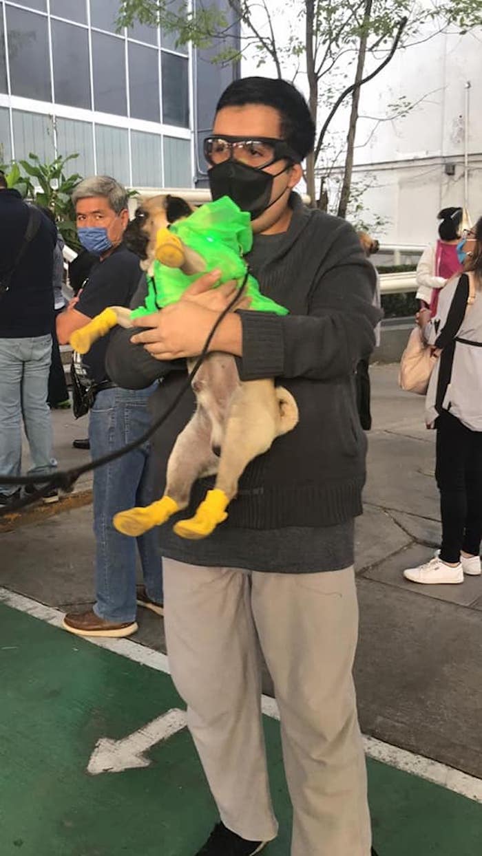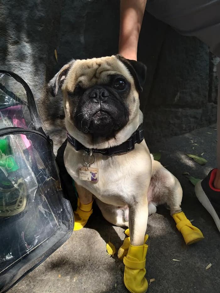 El pug viste botas miniatura color amarillo, un impermeable color verde y unas gafas. Harley padece discapacidad visual a causa de la falta de su ojo derecho, por lo que le han llamado "el tuerto".Foto: Facebook Psiquiatría CMN 20 de Noviembre.