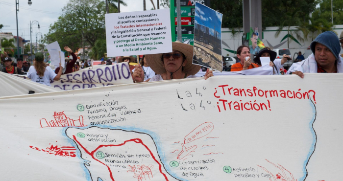 No solo el Tren Maya, y la modernización de dos puertos y el la línea del tren interoceánico. “La construcción de ese tren, viene acompañada de la instalación de 21 estaciones y zonas de desarrollo turístico, parques eólicos y fotovoltaicos, termoeléctricas, cerveceras, granjas de cerdos, cultivos de palma, soja y otros monocultivos, así como grandes desarrollos inmobiliarios, complejos hoteleros, centros comerciales, casinos, restaurantes y todo lo necesario para las grandes masas de turistas que se espera arriben a la península, provocando el despojo, el extractivismo voraz y la destrucción de las formas de vida de los pueblos mayas”, señalaron en el pronunciamiento final (https://bit.ly/4590WrR).