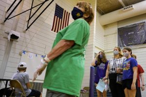 Los estudiantes y los padres usan mascarilla mientras esperan recibir una segunda dosis de la vacuna Pfizer COVID-19 durante una clínica de vacunación. Foto: Nam Y. Huh, AP.