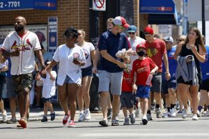 La gente cruza una calle mientras se dirige hacia el Wrigley Field de Chicago durante un partido de béisbol. Foto: Shafkat Anowar, AP.