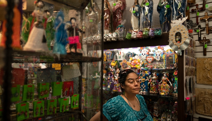 Las paredes estaban llenas de coloridos atuendos folclóricos de los 32 estados de México. En la parte trasera había trajes de mariachis negros con bordes dorados o plateados. En un armario de vidrio se veían artesanías con calaveras y otras figuras alusivas al Día de los Muertos.