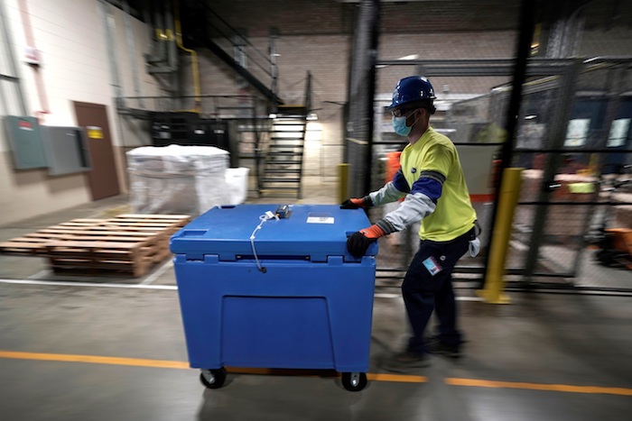 Los primeros camiones de reparto urgente comenzaron el domingo a salir de la planta de Pfizer en Portage (Michigan, Estados Unidos) con los primeros contenedores de vacunas contra la COVID-19.