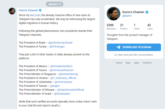Dúrov anunció que "a raíz de este fenómeno global, dos Presidentes iniciaron sus canales en Telegram": el Presidente de Brasil, Jair Bolsonaro (@jairbolsonarobrasil), y el Presidente de Turquía, Recep Tayyip Erdogan (@RTErdogan).