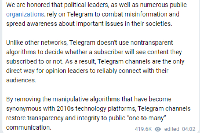 Según las declaraciones de Pável Dúrov, a diferencia de otras redes, Telegram no utiliza algoritmos no transparentes para decidir si un suscriptor verá el contenido al que se suscribió o no. Como resultado, los canales de la red social son la única forma directa para que los líderes de opinión se conecten de manera confiable con sus audiencias.