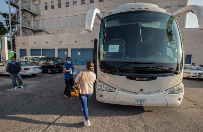 Enfermeras, médicos y personal del Hospital General de México son transportados en camiones a sus hogares. Foto: Victoria Valtierra, Cuartoscuro