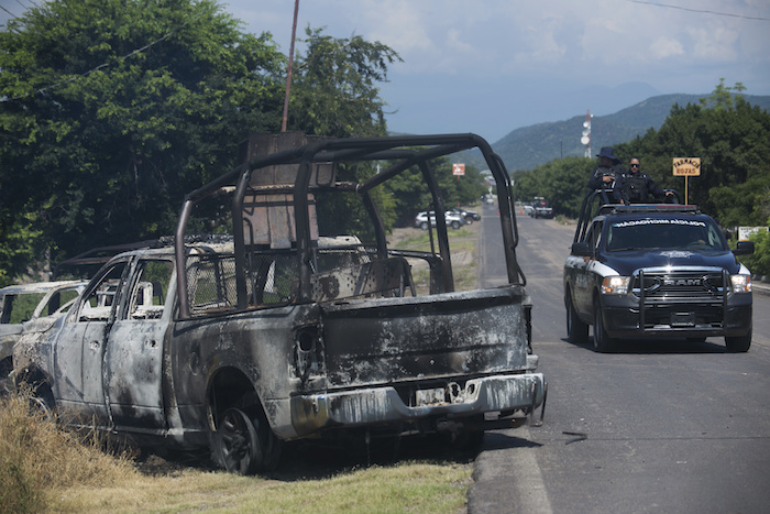 Una camioneta calcinada que pertenece a la policía estatal de Michoacán está junto a una carretera después de ser incendiada durante un ataque, mientras una patrulla estatal pasa a su lado en El Aguaje. Foto, Armando Solís, AP.