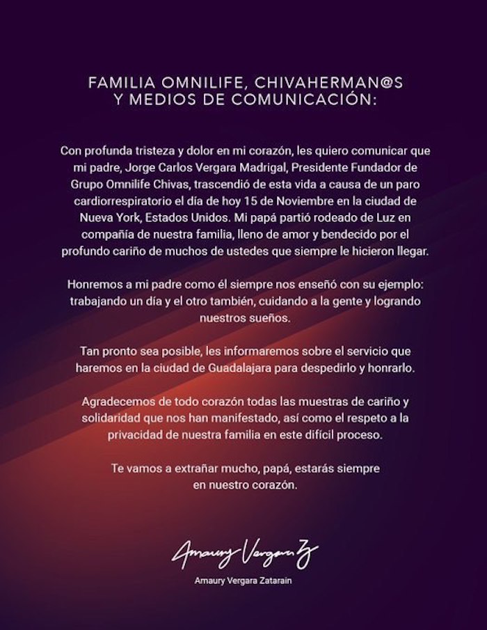 “Con profunda tristeza y dolor en mi corazón, les quiero comunicar que mi padre, Jorge Carlos Vergara Madrigal, presidente fundador de Grupo Omnilife Chivas, trascendió de esta vida”.