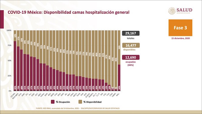 Sobre la ocupación de camas generales, la media se ubica en 44 por ciento. De los 29 mil 167 espacios, 12 mil 690 se encuentran con un paciente de COVID-19.