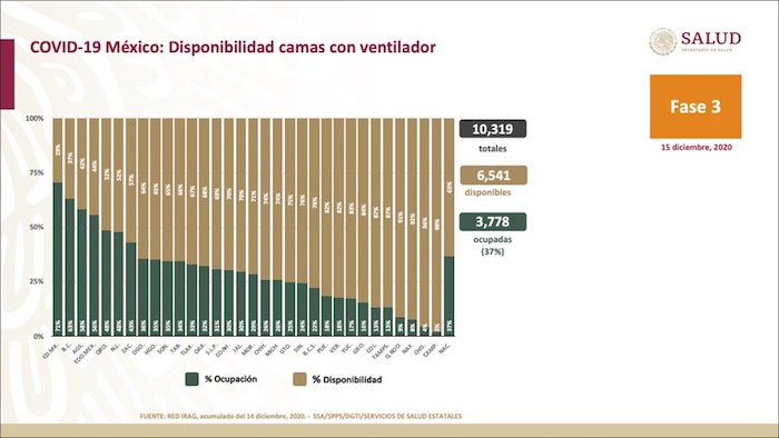 Mientras las camas con ventilador presentan una ocupación del 37 por ciento a nivel nacional. De los 10 mil 319 espacios disponibles, 3 mil 778 tienen un paciente con apoyo respiratorio.