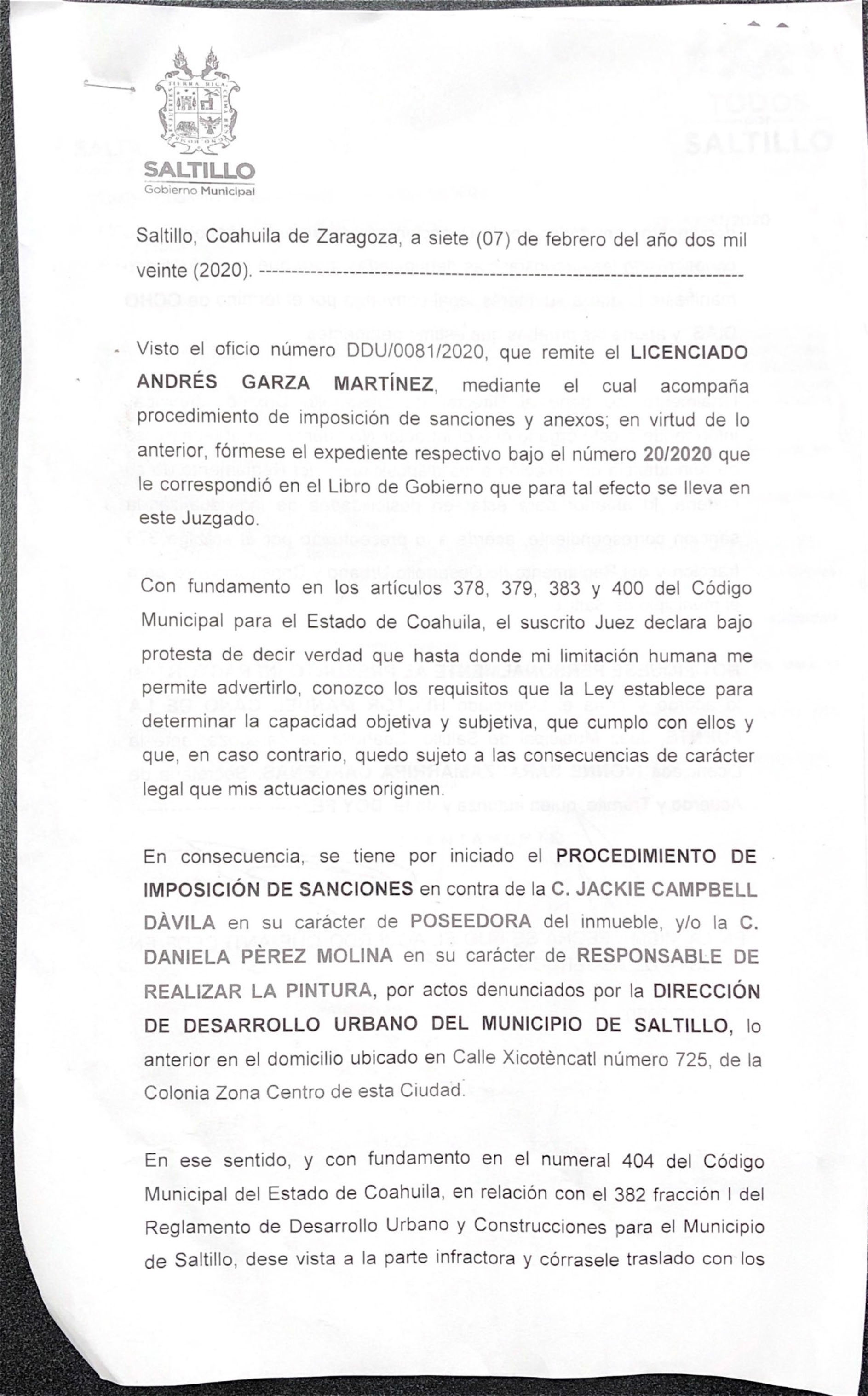 Lo anterior consta en documentos en poder de VANGUARDIA, según los cuales el procedimiento de imposición de sanciones es en contra de Campbell, en su carácter de poseedora del inmueble, y Daniela Pérez, en su carácter de responsable de realizar la pintura.