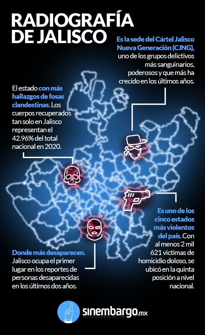 Jalisco también es la entidad federativa con el mayor número de cuerpos encontrados en fosas clandestinas con un total un total de 433 cuerpos, es decir, el 42.96 por ciento. Otros estados con mayor localización de restos son: Guanajuato con 204 (20.23 por ciento); Colima con 89 (8.83 por ciento); Michoacán con 73 (7.24 por ciento) y Zacatecas con 60 (5.95 por ciento).