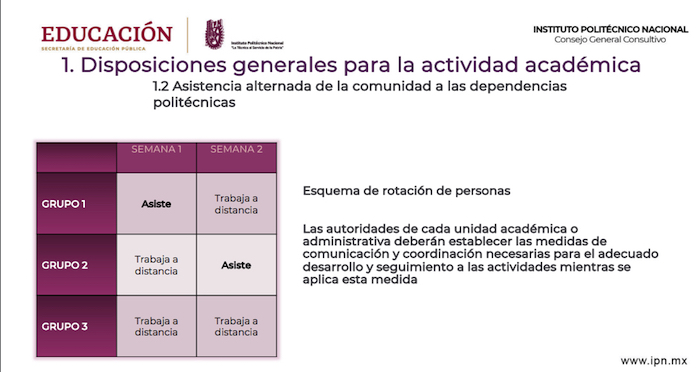 Se pretende dividir a la comunidad en tres grupos en donde el grupo 1 asiste la primera semana y durante la segunda trabajará a distancia; el grupo 2 trabajará a distancia durante la primer semana y en la segunda se asistirá de forma presencial y el grupo 3 trabajará a distancia durante el curso.
