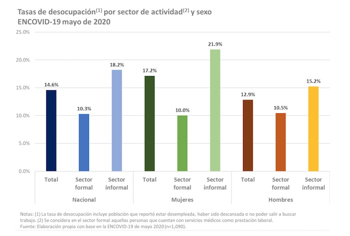 De acuerdo con la actualización de su Encuesta se Seguimiento de los Efectos del COVID-19 en el Bienestar de los Hogares Mexicanos (ENCOVID-19), 8.4 millones, es decir el 14.6 por ciento de la población económicamente activa, se encuentran desempleadas, sin goce de sueldo y sin poder salir a buscar trabajo.