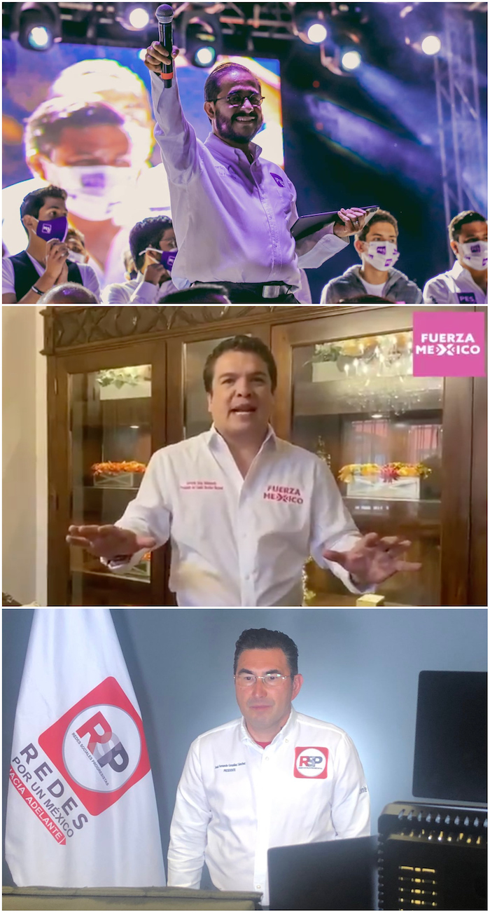 Hugo Eric Flores, Gerardo Islas y Fernando González Sánchez, dirigentes del PES, Fuerza por México y RSP. Fotos: Twitter.