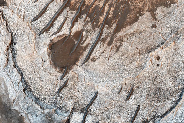 En los inviernos marcianos el hielo de dióxido de carbono cubre la superficie; después se sublima y pasa directamente de hielo a vapor al llegar la primavera. Cuando el hielo se rompe, el gas se libera y lleva arena con él, formando las dunas.