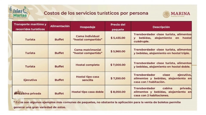 De acuerdo con Castillo Cepeda, los costos de los paquetes turísticos por persona irán desde los cinco mil 500 pesos y hasta los ocho mil, los cuales incluyen el transporte marítimo redondo, el alimento tipo buffet y el hospedaje, pero desde clase turística hasta clase "privada". Sin embargo, recalcó que los interesados en viajas a las Islas Marías podrán elegir todos los detalles de su paquete, es decir, qué tipo de hospedaje y transporte quieren, o si desean o no incluir el buffet o prefieren comprar alimentos a parte en la tienda de conveninencia con la que se cuenta en la isla.
