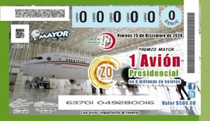 “Y el quinto, una rifa. 500 pesos. 6 millones de cachitos de la Lotería Nacional. En el caso de la Lotería serían 6 millones de números, de cachitos, en 500 pesos, son 3 mil millones; del avión son 130 millones de dólares, pero se le daría al que se ganara el avión incluido un servicio de operación de 2 años”, dijo.