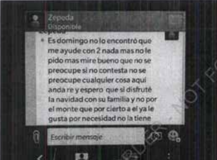El lunes 24 de octubre de 2016 Zepeda presuntamente escribió: "Jaja me quede dormido estaba muy cansado yo ando muy triste ya me abandono el ahijado verdad no se acordó de mi ya el fin que paso le i va a pedir ayuda vio lo que paso mala mente le pase comunicación con mi amigo" (sic).