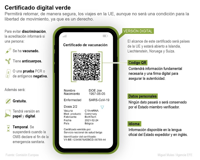 Según se ha informado desde la institución comunitaria, este documento sólo contendrá información esencial. Entre ese conjunto limitado de información estaría el nombre, la fecha de nacimiento, la fecha de emisión, un número de identificación único del certificado y la información relevante sobre el coronavirus: si se está vacunado, resultado de una prueba o recuperación.