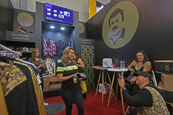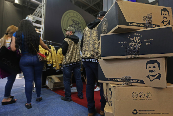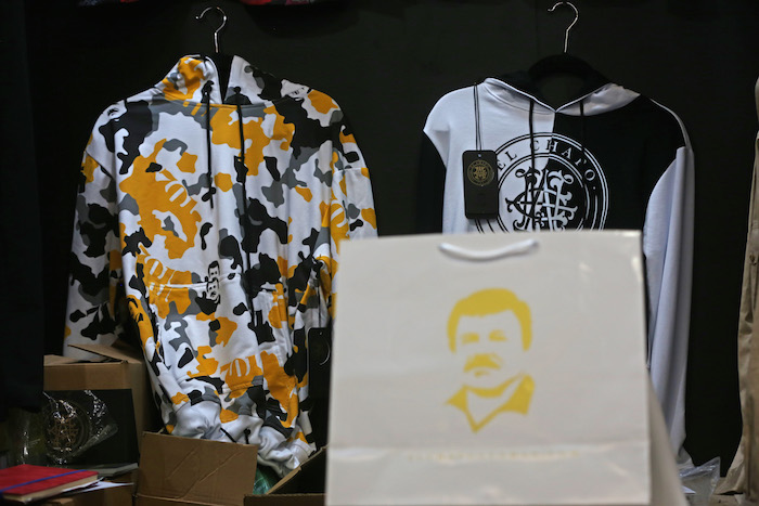 El rostro del líder del Cártel de Sinaloa preso aparece en las paredes del estand, en las prendas y hasta en las cajas donde se guarda la ropa.