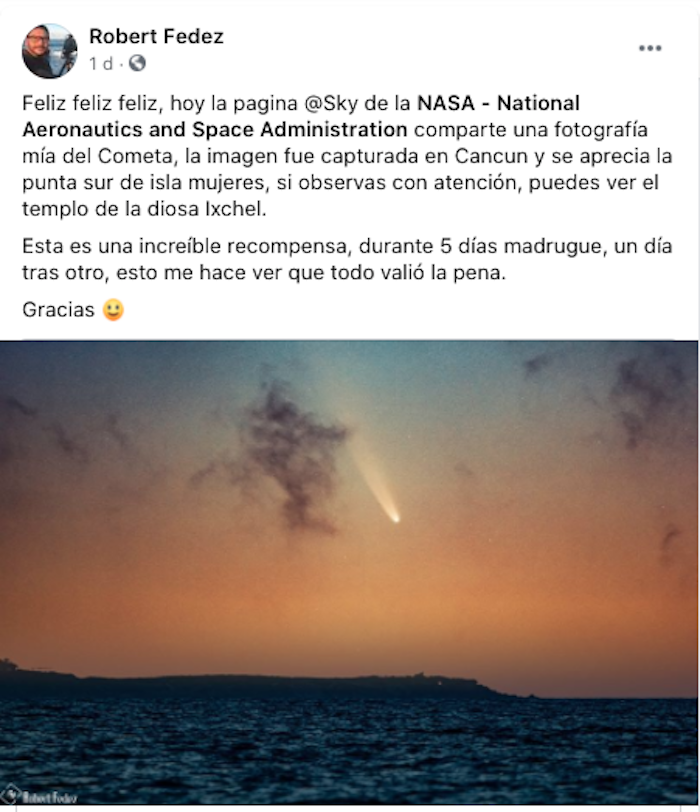 "Feliz feliz feliz, hoy la pagina @Sky de la NASA - National Aeronautics and Space Administration comparte una fotografía mía del Cometa, la imagen fue capturada en Cancun y se aprecia la punta sur de isla mujeres, si observas con atención, puedes ver el templo de la diosa Ixchel", escribió Fernández en su cuenta de Facebook.