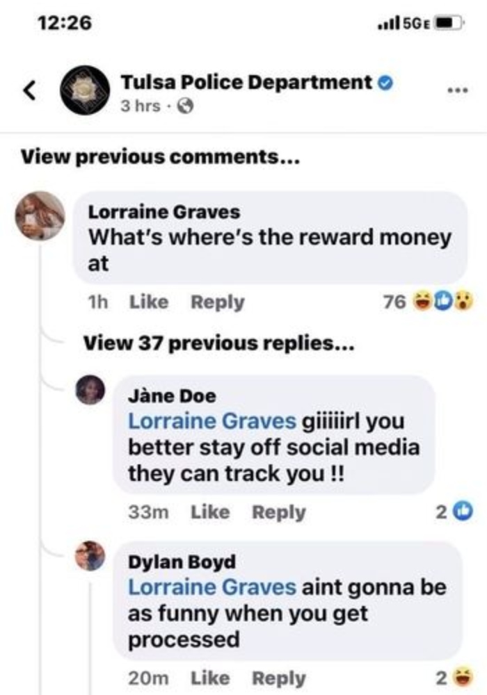 Para sorpresa de los oficiales, la sospechosa comentó el post preguntando por el dinero de la recompensa. "¿Dónde está el dinero de la recompensa?", bromeó. Al día siguiente, Graves fue localizada y arrestada por el cargo de cómplice de asesinato.