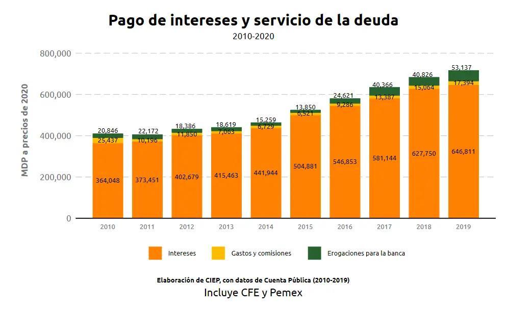 En el análisis "El costo financiero de la deuda en México", publicado por Carlos Vázquez Vidal, el CIEP detalló que sólo en 2019 México pagó 689 mil 813 millones de pesos por concepto de intereses de la deuda. El dato es equivalente al 5 por ciento del crecimiento real con respecto a 2018.