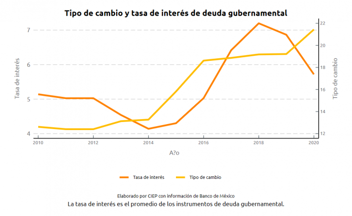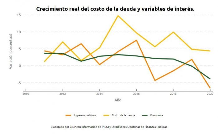 Con estos datos, destacó el Centro de Investigación Económica y Presupuestaria (CIEP), "el presupuesto que se destina al costo de la deuda pública crece más rápido que el presupuesto que se destina para ofrecer bienes y servicios públicos. El aumento sostenido del costo financiero de la deuda obedece al continuo déficit público, altas tasas de interés y la depreciación del tipo de cambio en los últimos años"