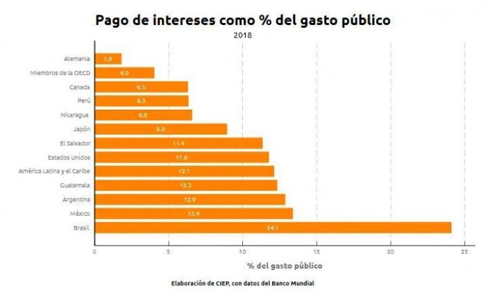 "México se encuentra entre los países de la OCDE, que destina mayor porcentaje del gasto público para el pago de intereses de la deuda. En 2018 el pago de intereses absorbió 13.4 por ciento del gasto público, mientras que, en promedio, los miembros de la OCDE destinaron 4 por ciento del gasto para el pago de intereses".