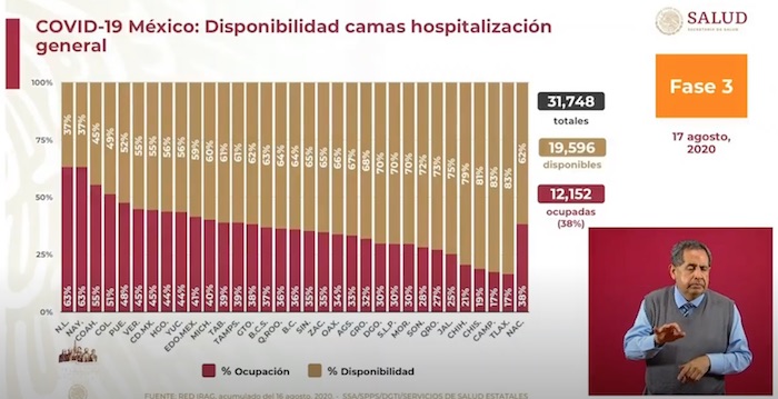 Sobre la ocupación hospitalaria, el funcionario detalló que la media nacional se ubica en 38 por ciento. De los 31 mil 748 espacios disponibles, 12 mil 152 cuentan con un paciente en camas generales.