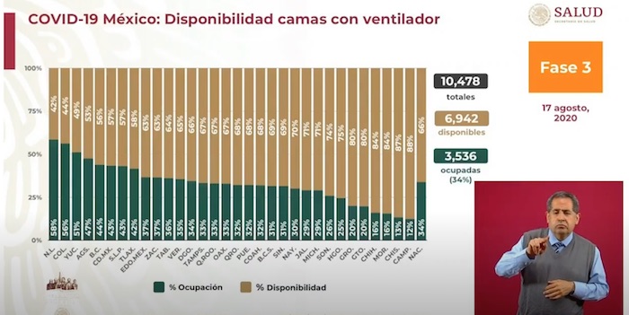 La ocupación de camas con ventilador es del 34 por ciento a nivel nacional. De los 10mil 478 espacios, 3 mil 536 están ocupados.